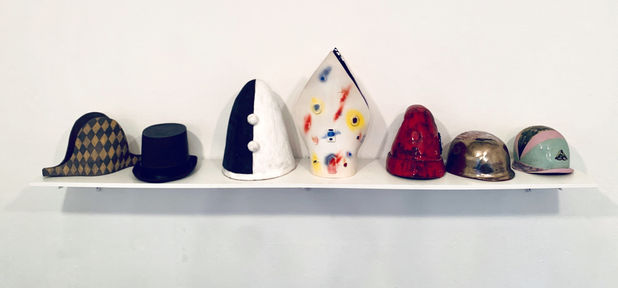 The show Talking Hats presents a series of ceramic sculptures in the shape of various hats at the Zagreus gallery. The cap itself is a simple bowl form and seems to reflect the cranium of a skull or an empty vessel.